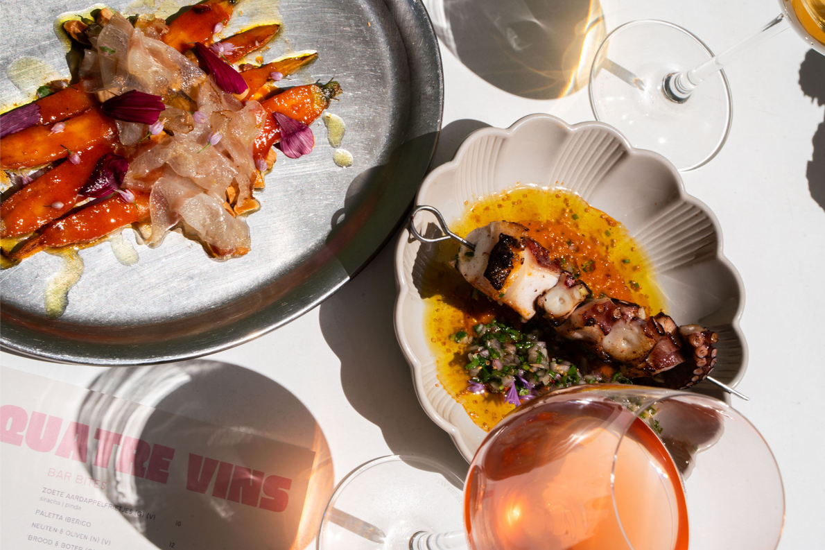 After ten years of experience, we felt it was time for our own place: Quatre Vins. Maxinne welcomes you with her smile and makes you feel at home right away. Olivier runs the kitchen and introduces you to his world of natural wines. Together, we create a relaxed atmosphere with tasty dishes, good music, and moments to remember.